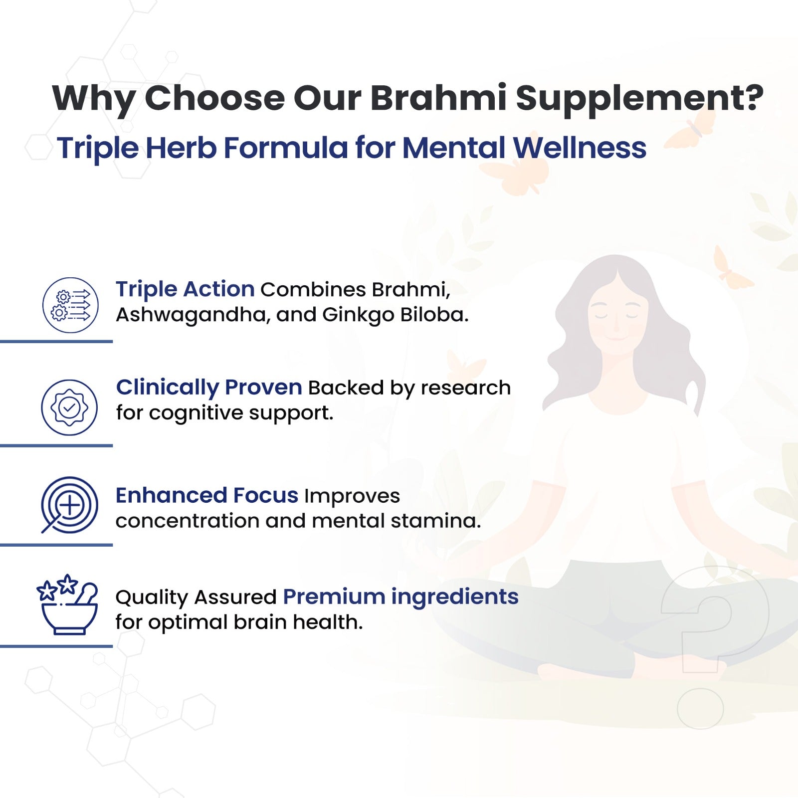 Advanced blend of Brahmi, Ginkgo Biloba, and Ashwagandha offers a comprehensive approach to cognitive health. This superior formulation delivers enhanced mental performance, stress relief, setting it apart from single-ingredient supplements