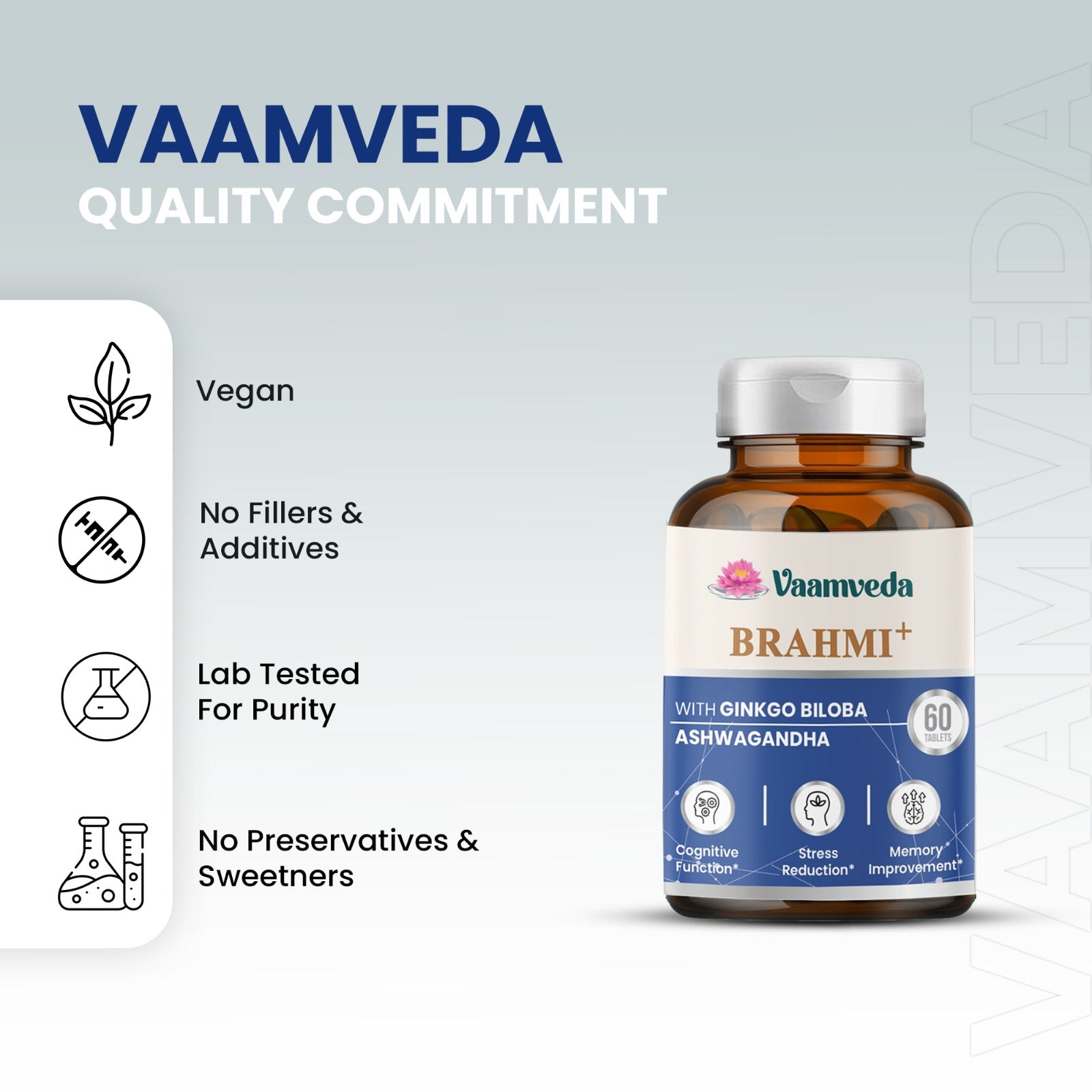 Brahmi extract, combined with Ginkgo Biloba and Ashwagandha, supports improved memory retention and recall. These herbs work synergistically to enhance brain function, promoting better cognitive performance and sharper memory over time.