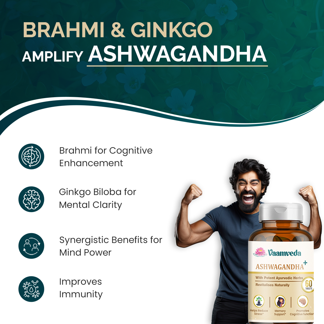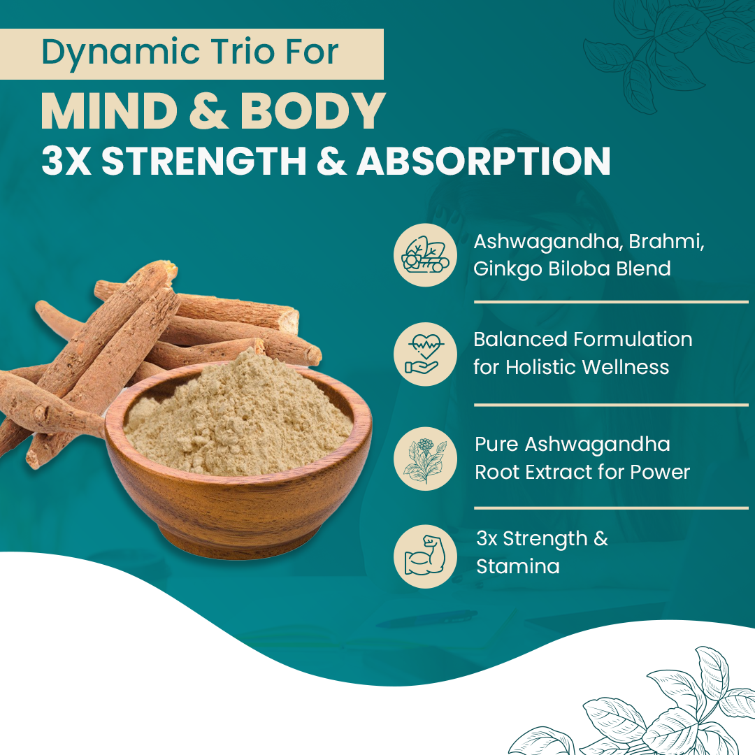 Elevate your well-being with our potent blend of stress-relieving Ashwagandha, cognitive-boosting Ginkgo Biloba, and mood-enhancing Brahmi. Experience vitality and clarity today!