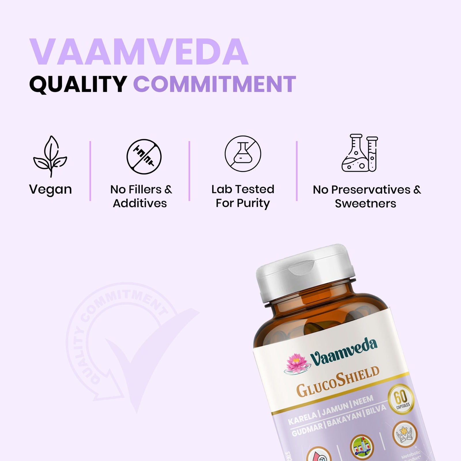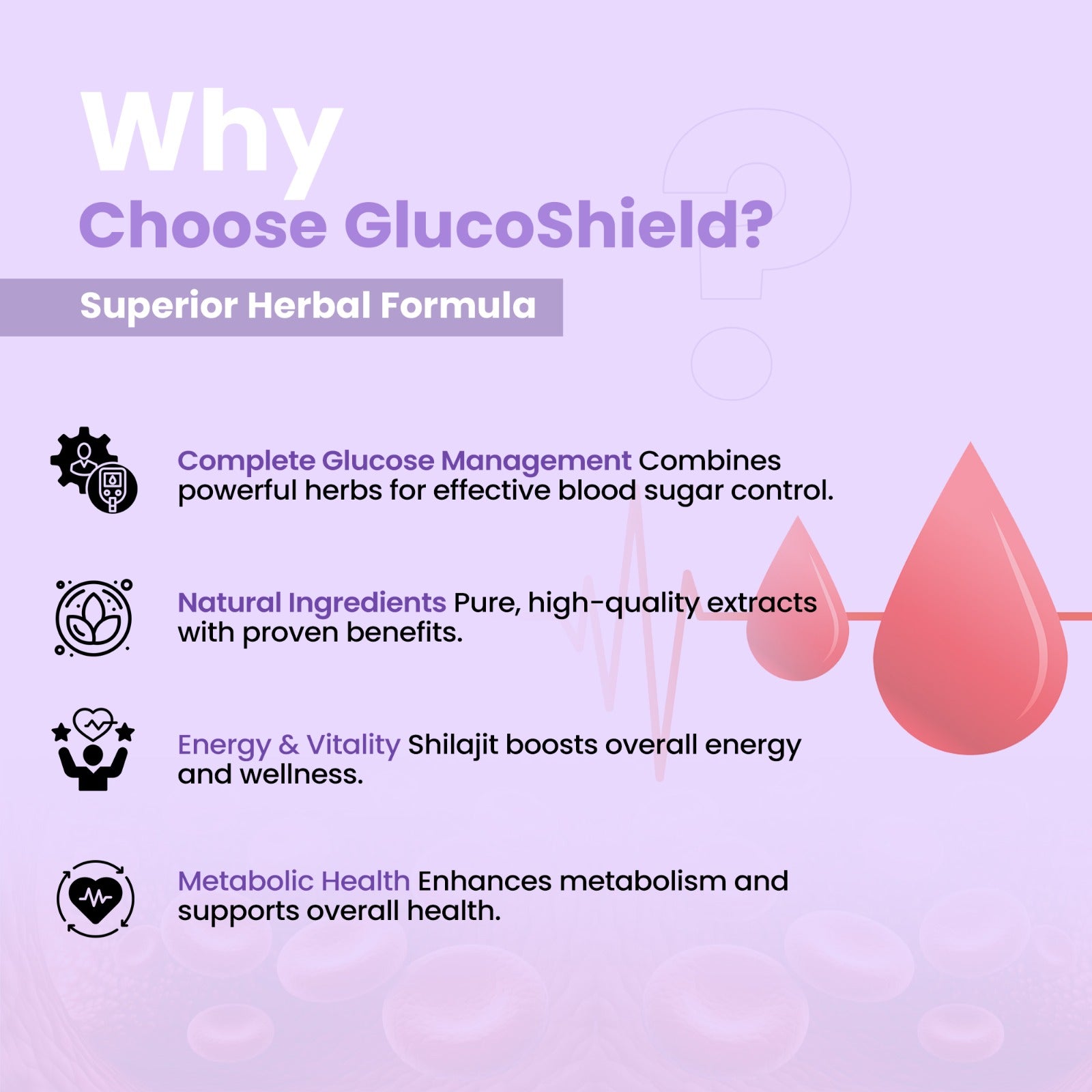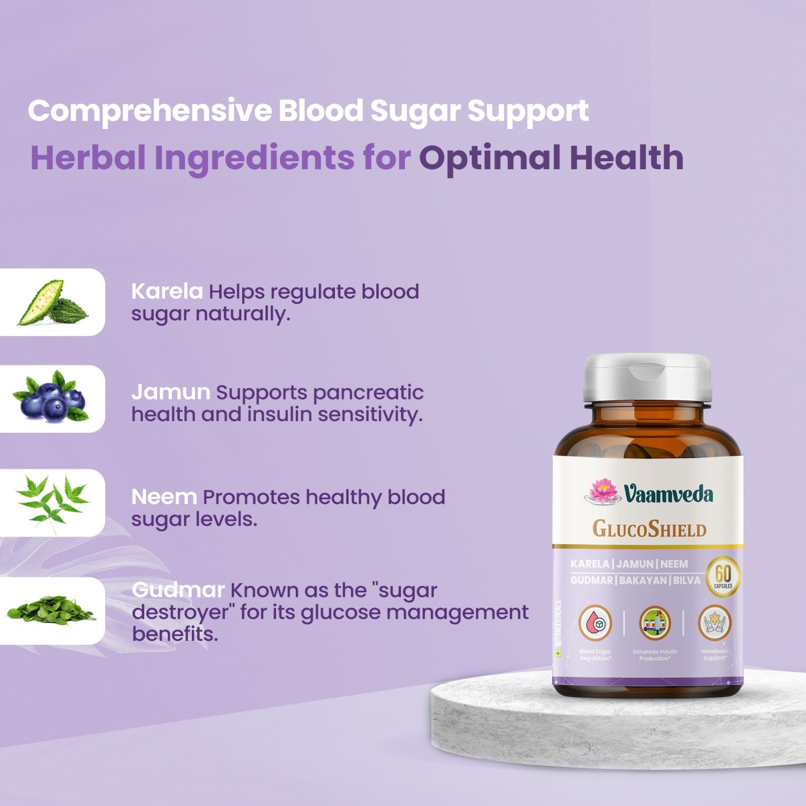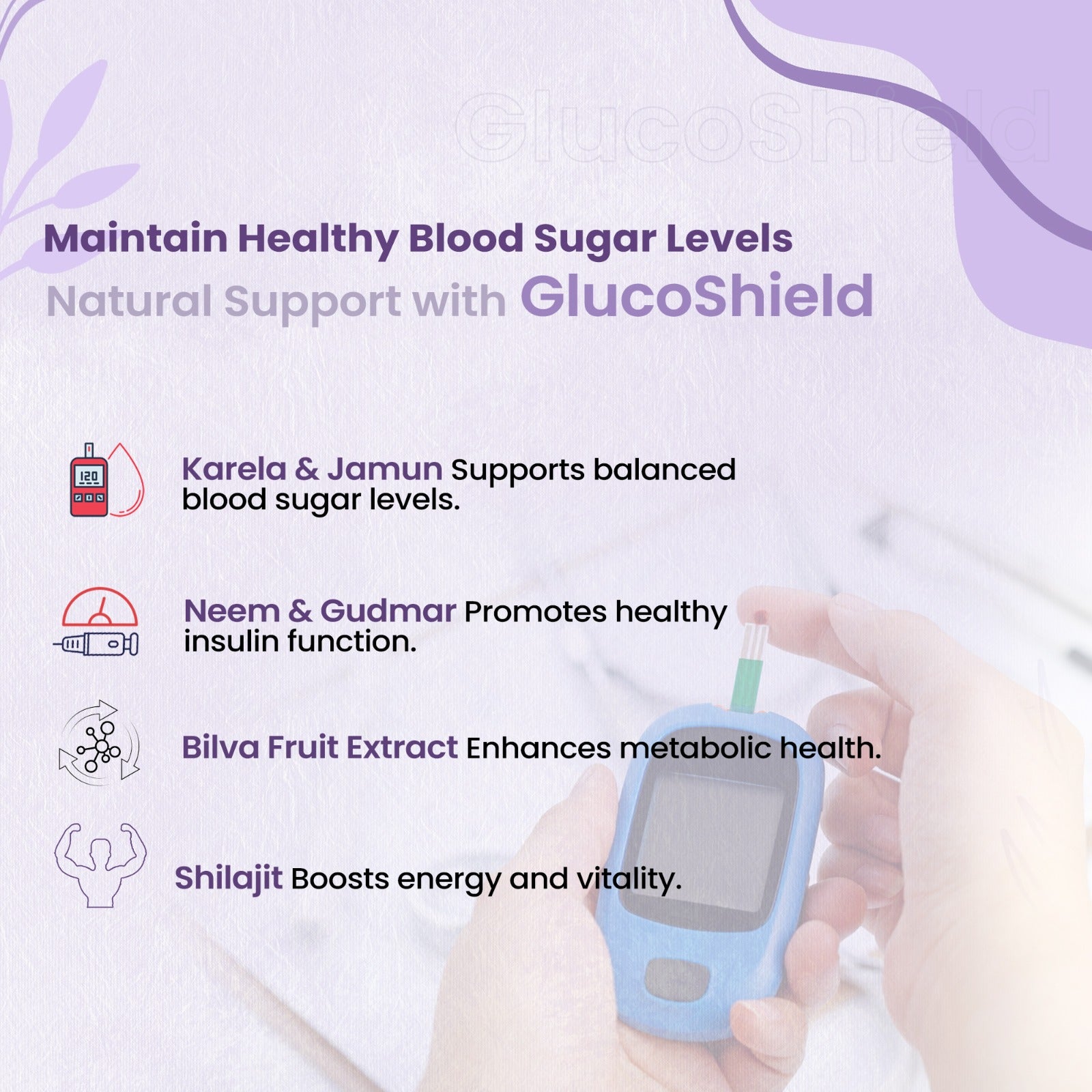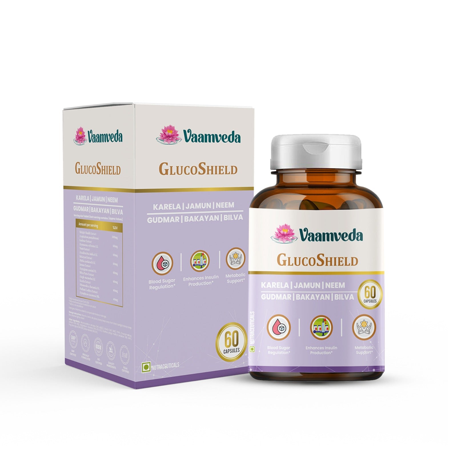 GlucoShield help support healthy blood sugar levels with Karela, Jamun, and Gudmar, known for their glucose-lowering properties. This blend helps maintain stable insulin levels, promoting overall metabolic health.