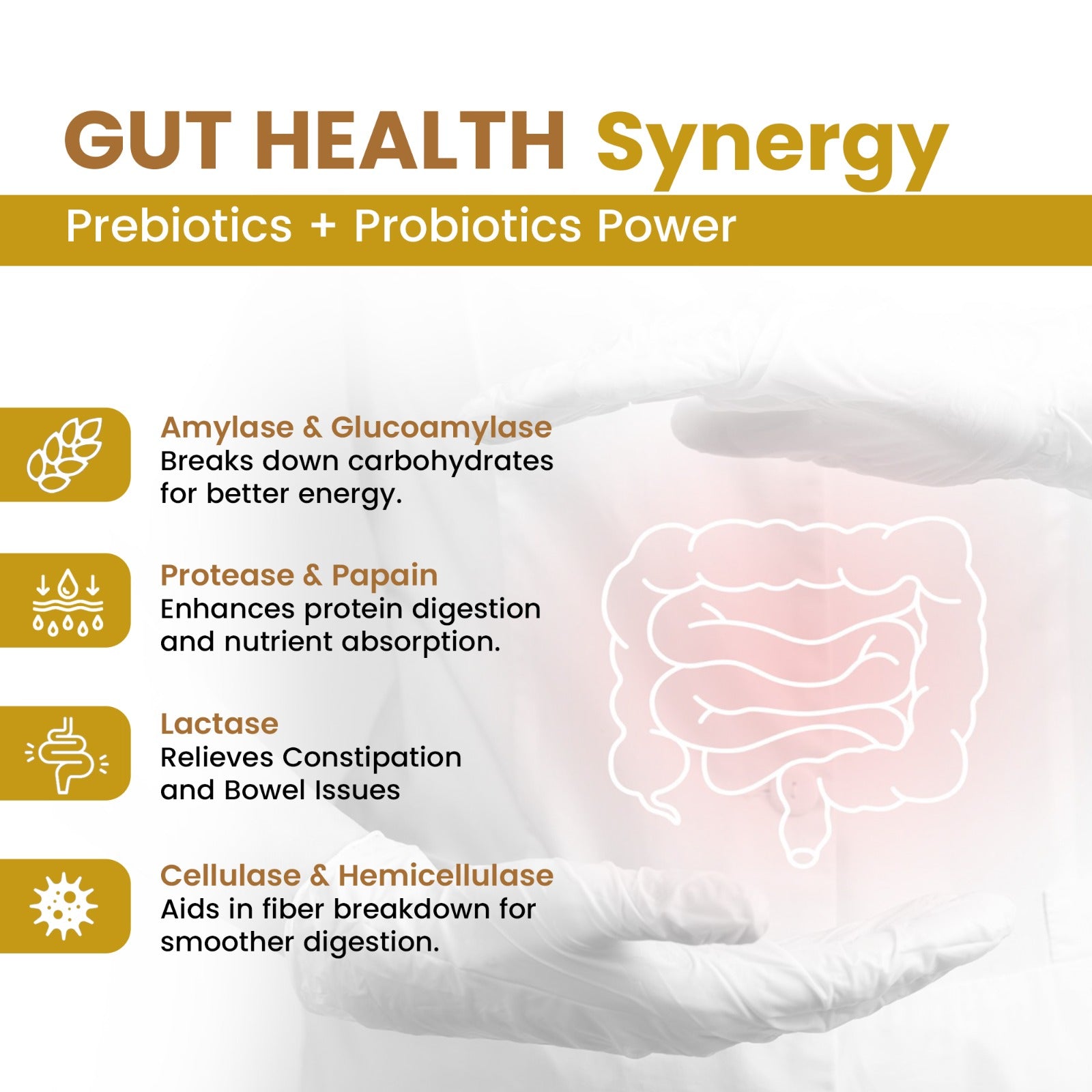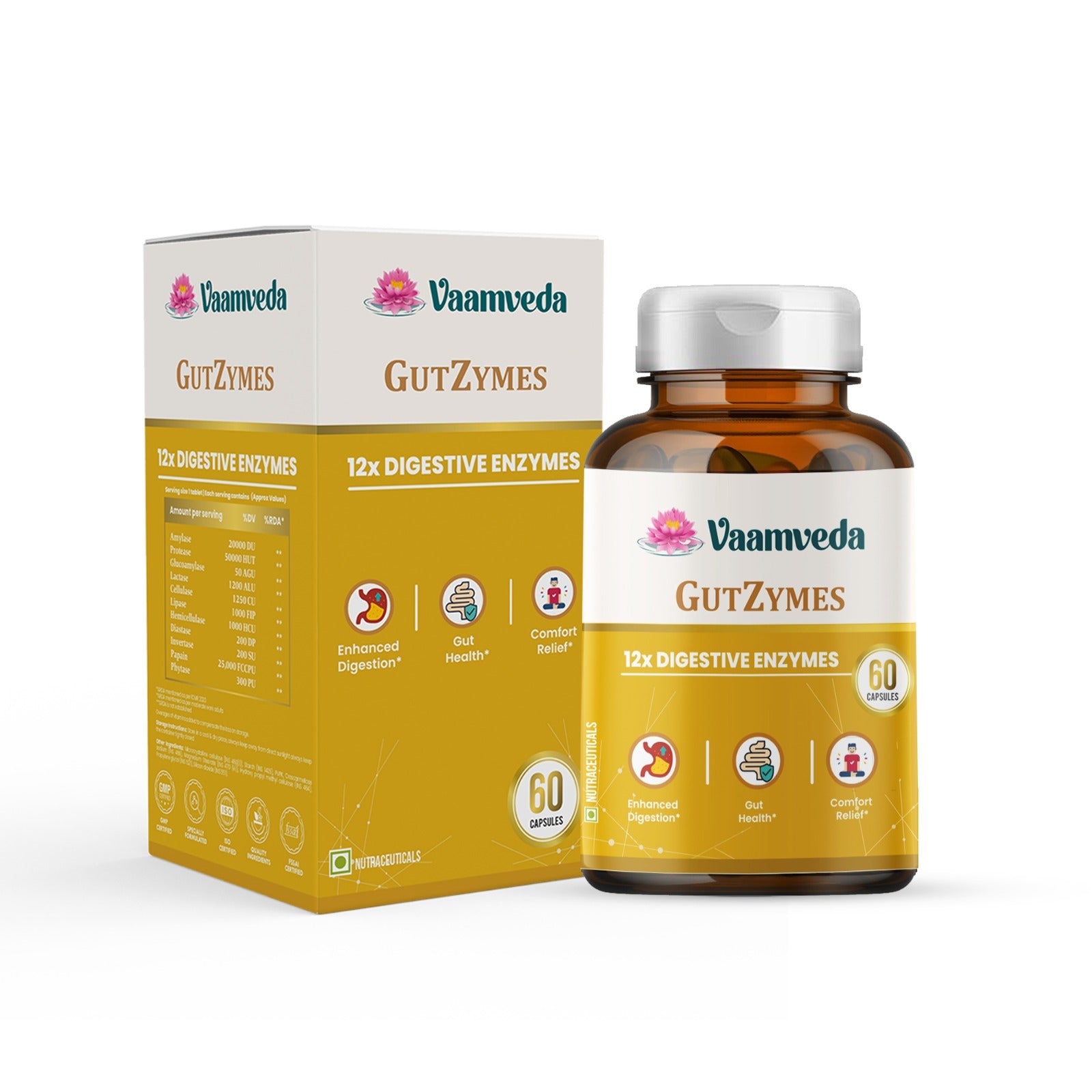 The supplement helps reduce bloating, gas, and indigestion by supporting optimal digestion. Enzymes like amylase, protease, and lipase assist in breaking down food, promoting digestive ease.