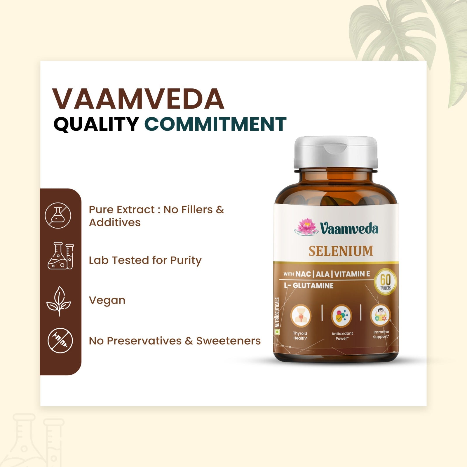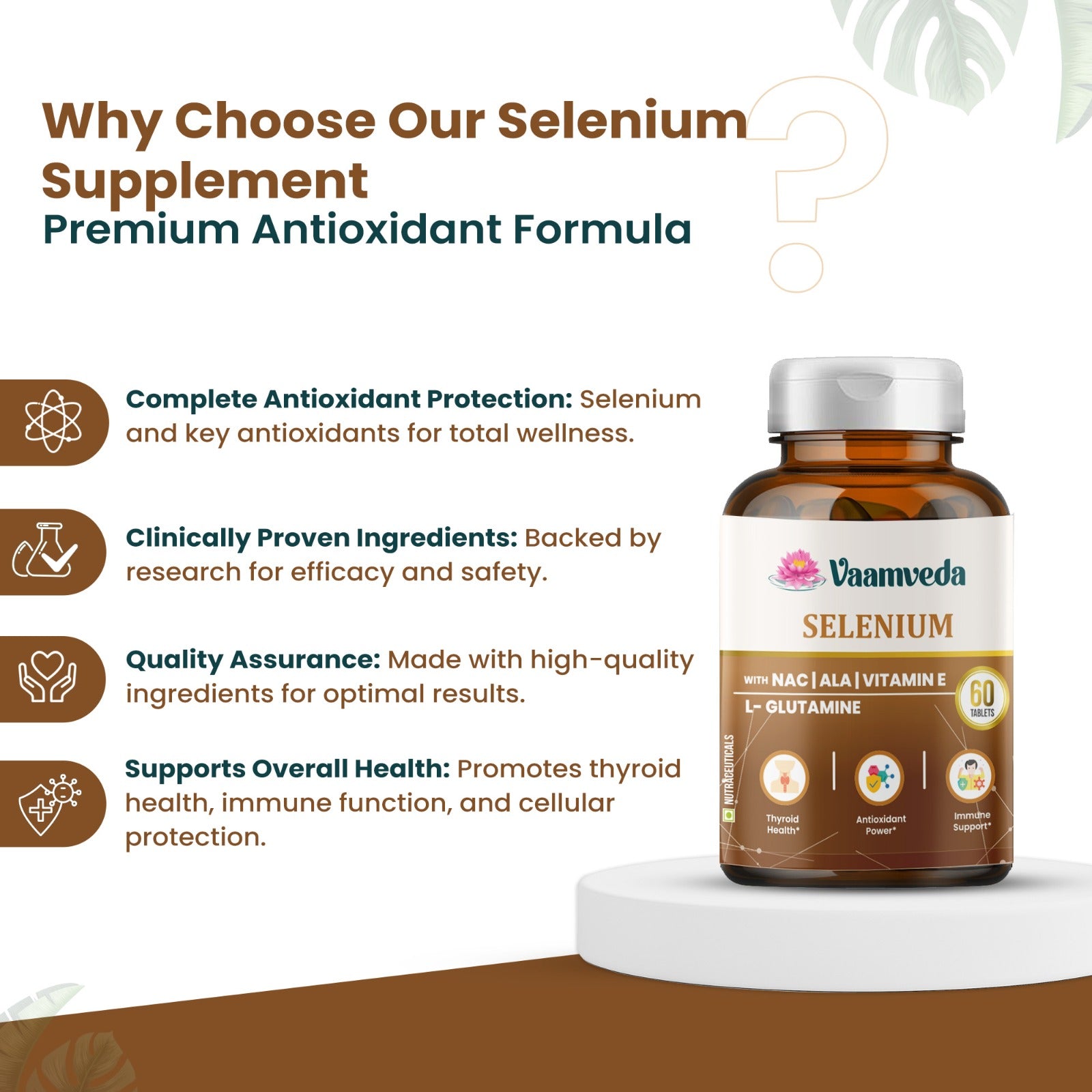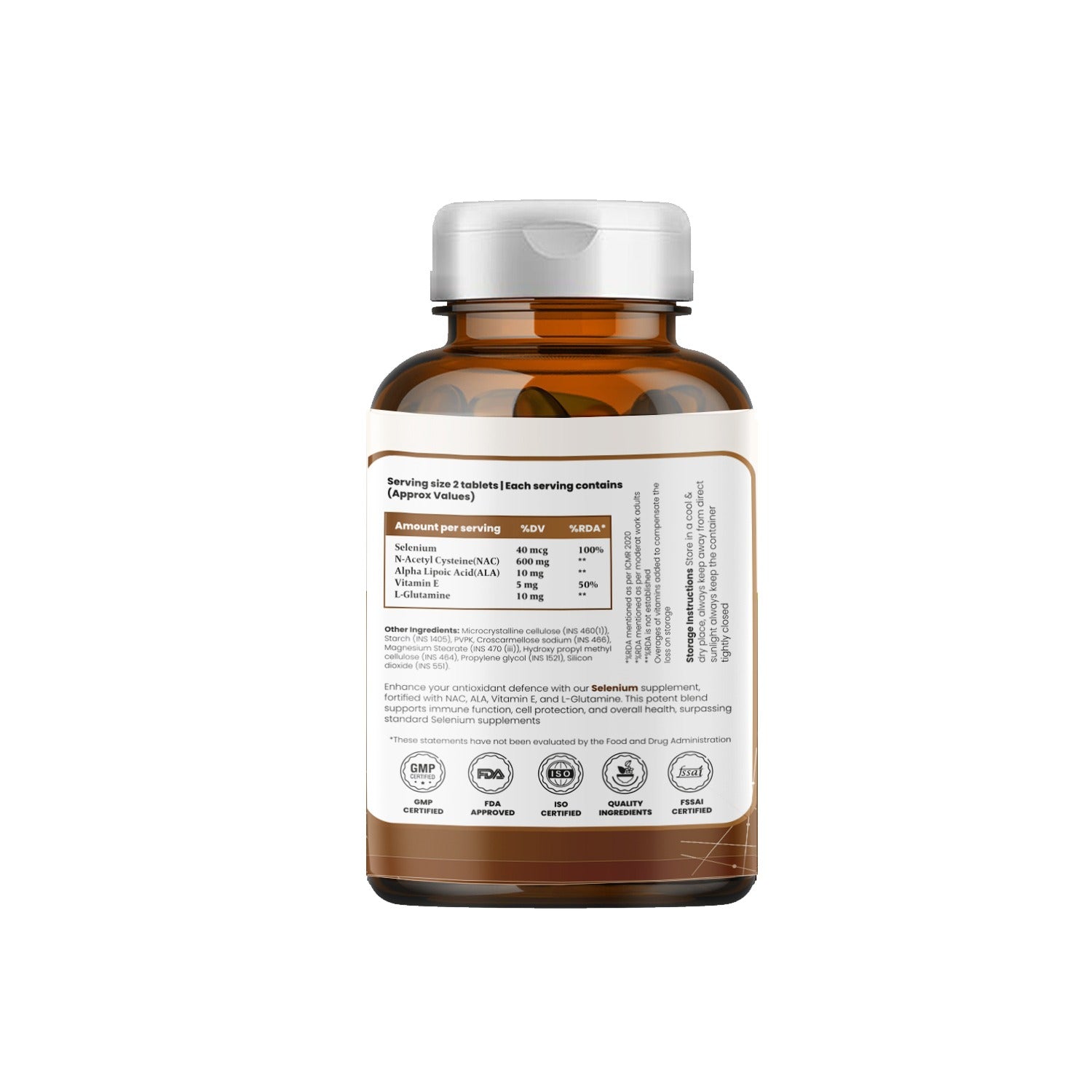 Selenium, along with NAC, ALA, Vitamin E, and L-Glutamine, strengthens immune response, supporting immune cell activity and defending against infections. Regular use helps maintain immune function.